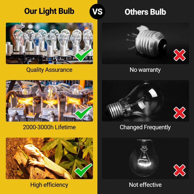 - Upgraded Long Life Bulb:The Upgraded Reptile Heat Bulb Adapting cleaning sand manufacturing process in which light is soft and more suitable for reptile growth. Operation life up to 2000-3000 hours. Pack of two 100W Lamp,one infrared basking spot Lamp and one UVA daytime heating lamp bulb.