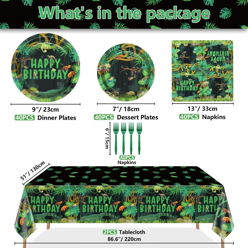 - Reptile Snake Party Supplies: Package includes 40 x 9’’ dinner plates, 40 x 7’’ dessert plates, 40 x napkins, 40 x forks, 2 x tablecloths.