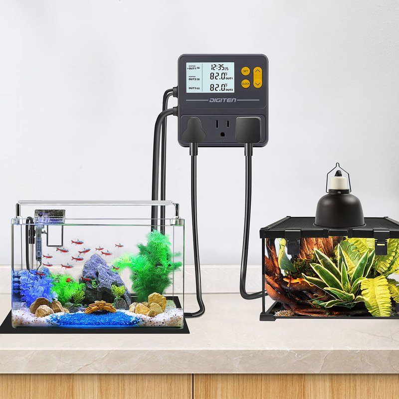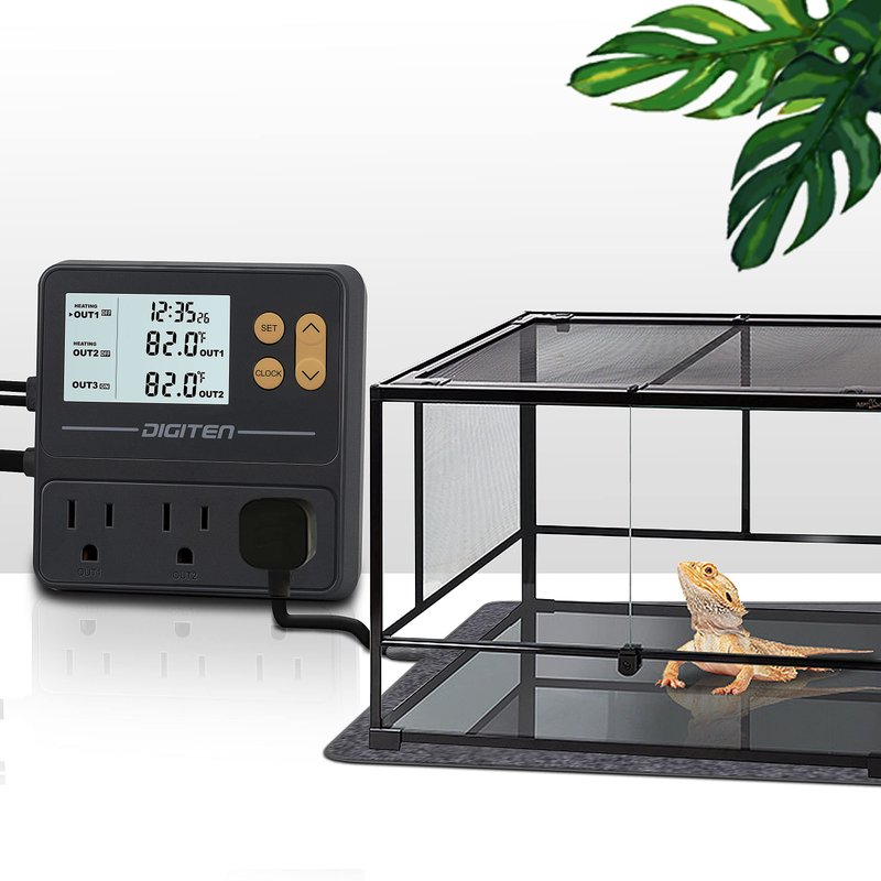 - 🦎🍄 Timer thermostat for reptiles, 3 plugs outlet can work independently. Integrated design with day/night temperature and timing control, which can meet the physiological needs of temperature, and lighting for reptiles, amphibians, or plants.
