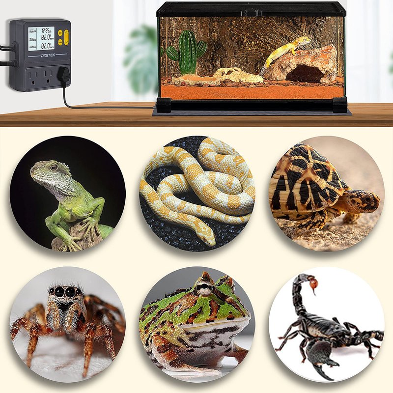 - 💡🐦Unique design, reptile-friendly design. Raising snakes, lizards, ball pythons, chameleons, corn snakes, tortoises, bearded dragons, and frogs need a controller like this, which can customize the time and temperature of your pet, control the lighting time, control the temperature, and scientifically raise reptiles.