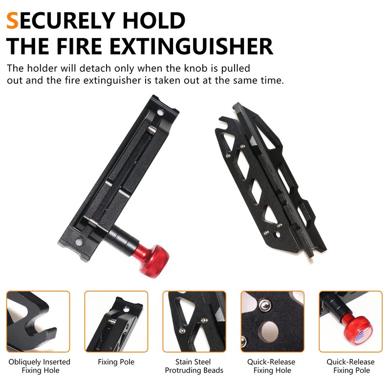 - HOLD FIRMLY--With a special mounting design, the holder will detach only when the knob is pulled out and the fire extinguisher is taken out at the same time. Hold the fire extinguisher firmly on the bumpy road.