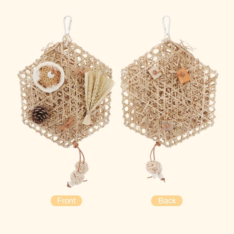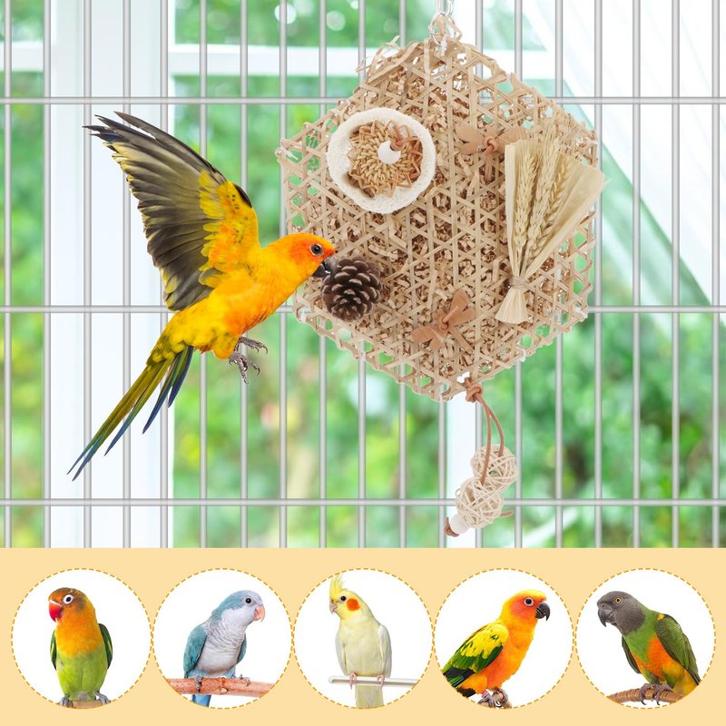 - Our bird foraging toys parakeet toys are made from natural pine cones, loofahs, wheat ears and shredded paper stuffing. Safe materials allow parrots to play carefree and relieve their boredom