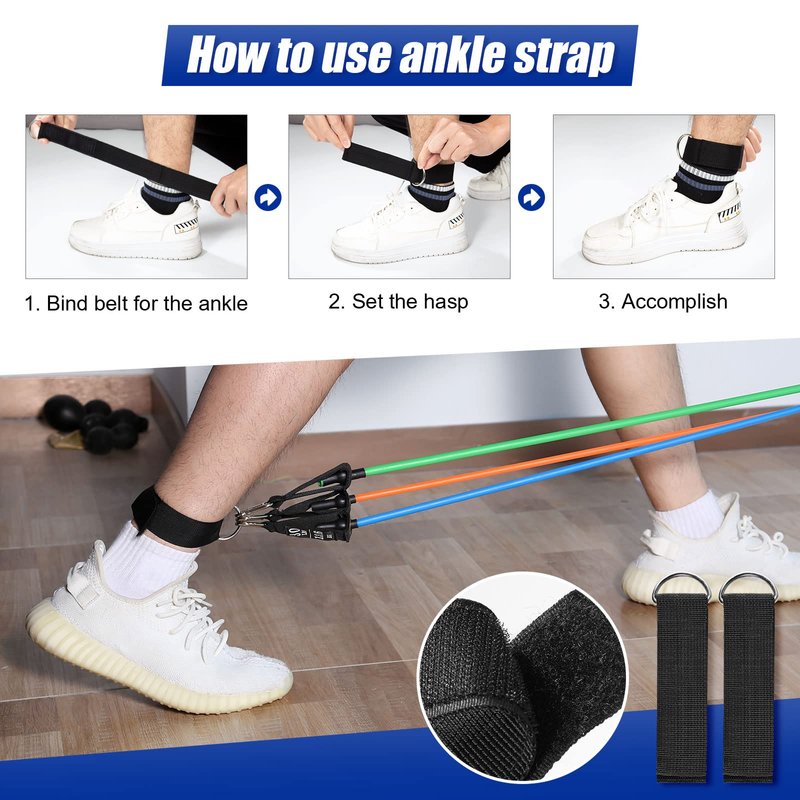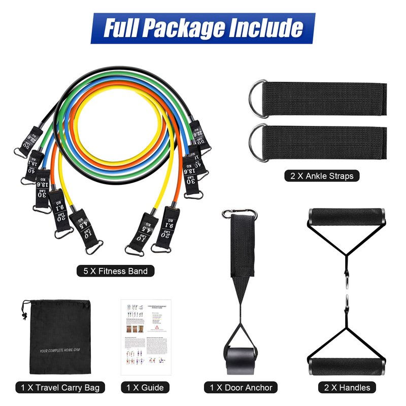 - 【12pcs in one set】: 5pcs different resistance bands[ Black (50lbs) > Green (40lbs) > Blue (30lbs) > Orange (20lbs) > Yellow (10lbs)], 2pcs anti-slip handles, 1pcs premium door anchor, 2pcs ankle straps,1pcs workout guide and 1pcs carry gift bag, you can have all in one set, easy to train, easy to carry for travelling.