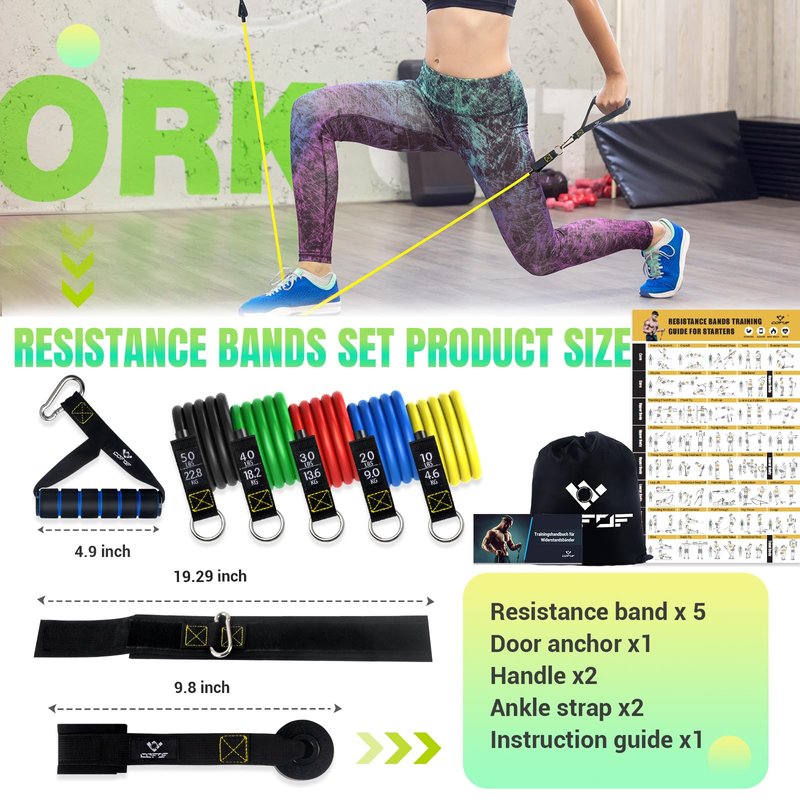 - [Perfect Workout Set & Brand Service] Our resistance bands set with door anchor contains 5 latex tubes in different colors, 2 cushioned handles, 2 ankle straps, 1 Training Poster, 1 carrying bag, and 1 exercise guide. We stand by our resistance bands set with our outstanding customer service, If you have any problems, please don't hesitate to contact us.