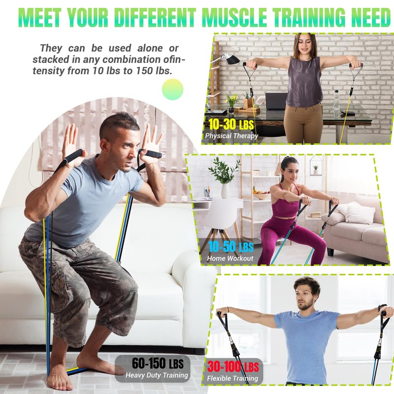 - [Adjustable Resistance Bands with Handles] The exercise bands have 5 colors standing for different resistance levels, Yellow (10 lbs), Blue (20 lbs), Green (30 lbs), Black (40 lbs), Red (50 lbs). Our resistance bands set can be used alone or stacked in any combination. The resistance bands with handles offers a total of 15 tension levels that range from 10 Lbs to 150 Lbs max. This workout bands meets your exercise needs whether you're a fitness enthusiast or a beginner.
