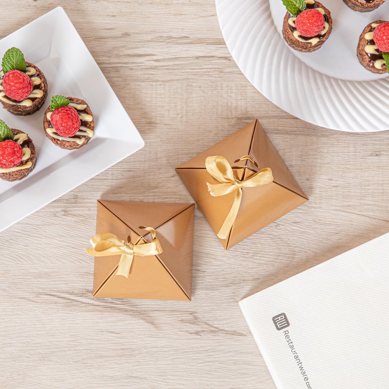 Restaurantware Pastry Tek 3 x 3 x3 Inch Pyramid Favor Boxes 100 Pyramid Triangle Gift Boxes - Satin Ribbon Disposable Brown Paper Triangle Candy Boxes For Weddings Or Parties