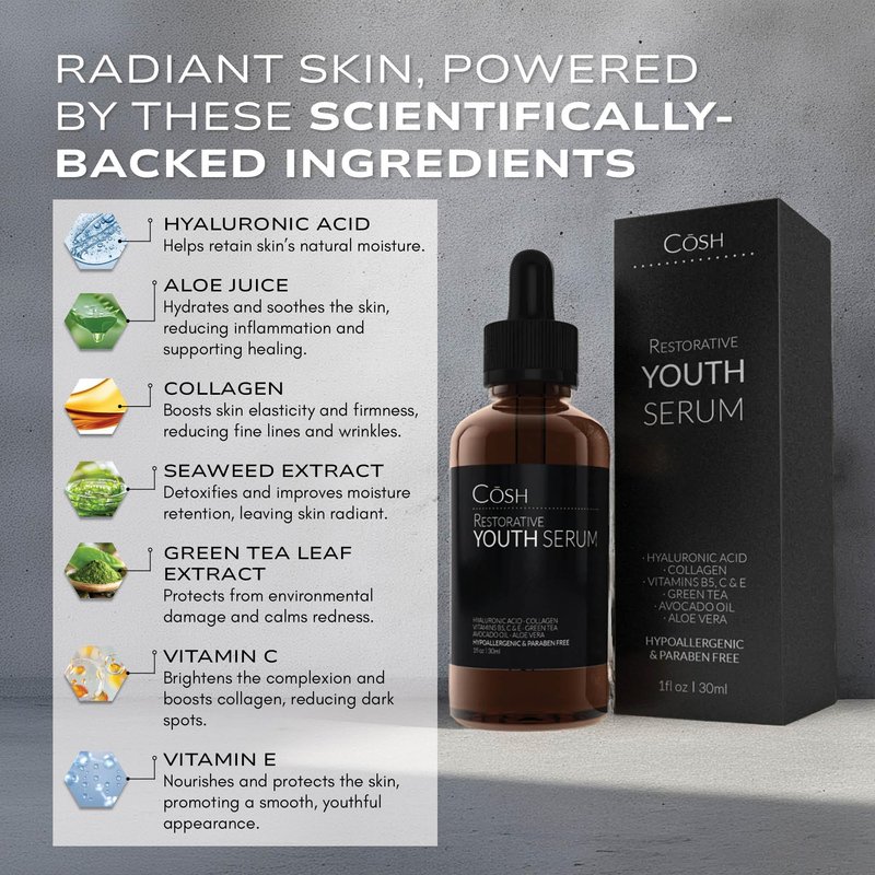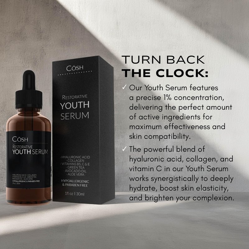 - BOOST YOUR SELF-CARE ROUTINE: Enhance your self-care routine with CŌSH Youth Serum. This powerful formula supports healthy, youthful skin, turning back the clock on your complexion. Packed with antioxidants and hydrating, it revitalizes and nourishes skin, promoting a radiant and refreshed appearance.