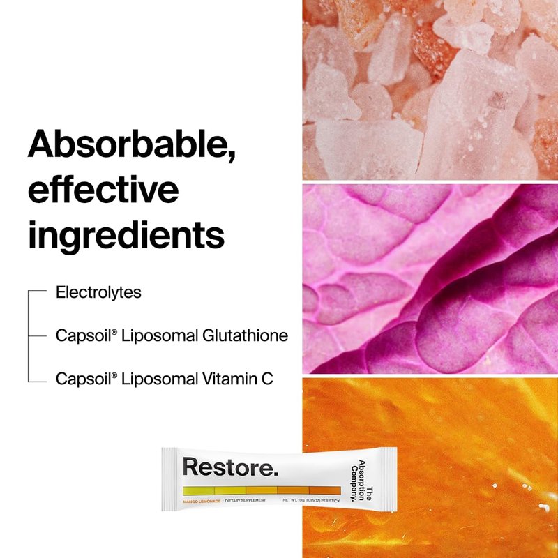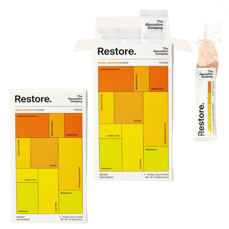 Restore Supplement - Mango Lemonade - 700mg of Electrolytes Powder Packets to Aid Hydration for Post Workouts or Rough Mornings, Boost Immune Support with Liposomal Vitamin C - 14 sticks