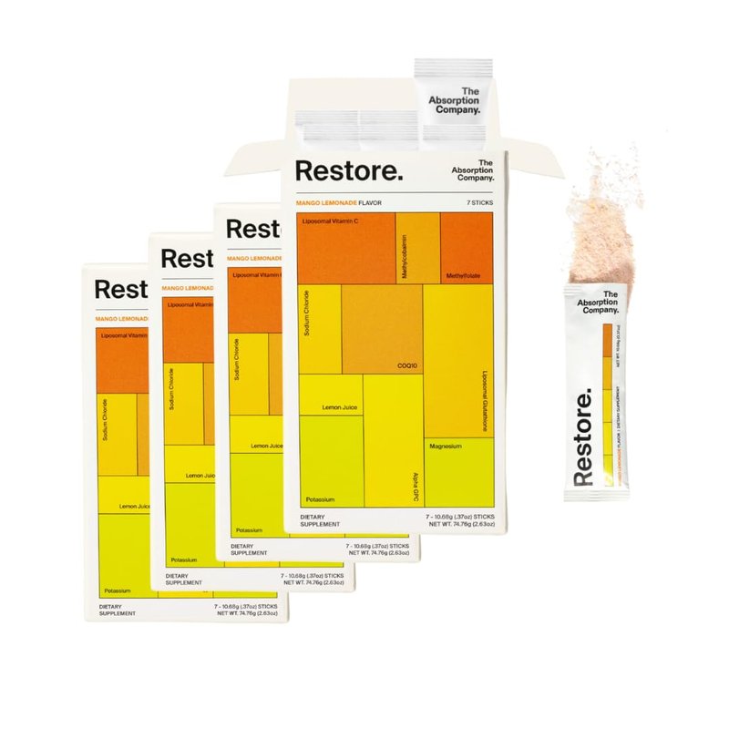 Restore Supplement - Mango Lemonade - 700mg of Electrolytes Powder Packets to Aid Hydration for Post Workouts or Rough Mornings, Boost Immune Support with Liposomal Vitamin C - 28 sticks