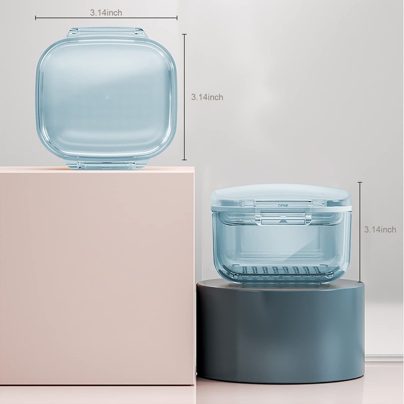 - š¦·ćProfessional Retainer Caseć:Unique denture bath with drain tray, The denture case is 3.15" x 3.15" x2.36" inch, allowing you to quickly and easily lift out your dentures, retainer, mouthguard, Invisalign, or nightguard without touching your cleaning solution.