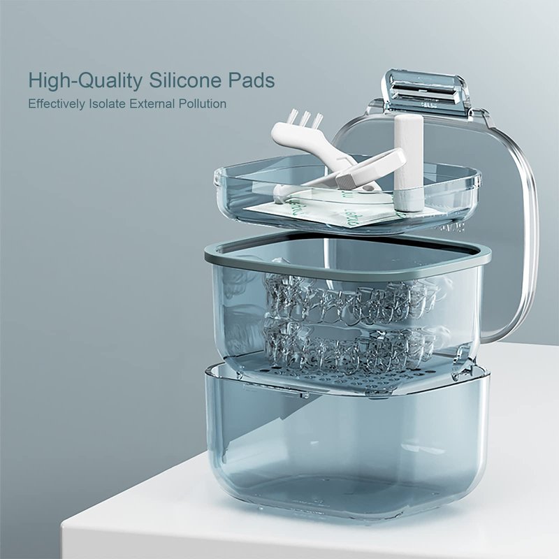 š¦·š¦·Unique denture bath with drain tray, The denture case is 3.15" x 3.15" x2.36" inch, allowing you to quickly and easily lift out your dentures, retainer, mouthguard, Invisalign, or nightguard without touching your cleaning solution. (Noteļ¼ļ¼ No Accessories)