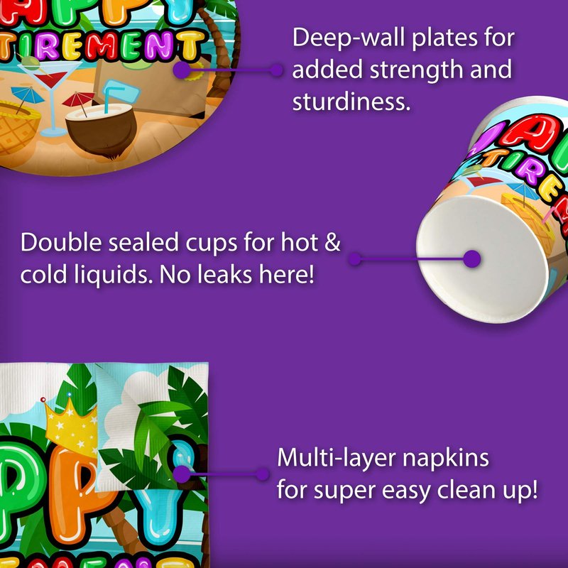 - PREMIUM DESIGN - Our Retirement Themed Party Supplies are suitable for girl’s and boy’s birthday parties, holiday celebrations with your family and friends, special events or for just fun-filled daily meals, snacks, and desserts with picnics and cookouts. Shrieks of joy will be your reward when you use these fun and unique party tableware sets.
