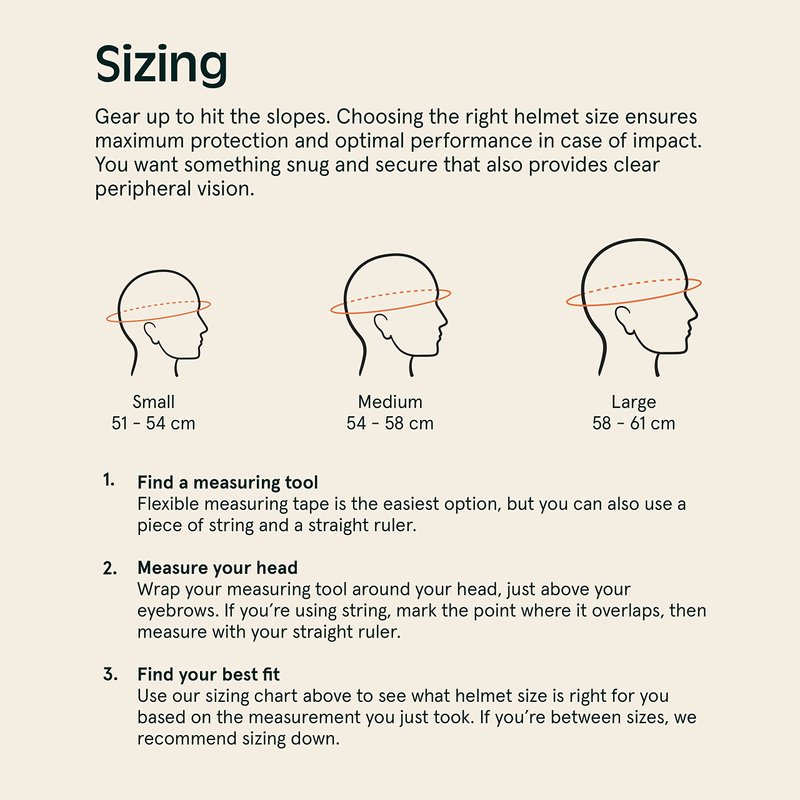 - SIZING GUIDANCE - To determine the correct adult ski helmet or youth ski helmet size, wrap a measuring tape around your head. The tape should rest just above your ears and remain level around the circumference of your head. S: 52-55 cm, M: 55-58 cm, L: 59-62 cm