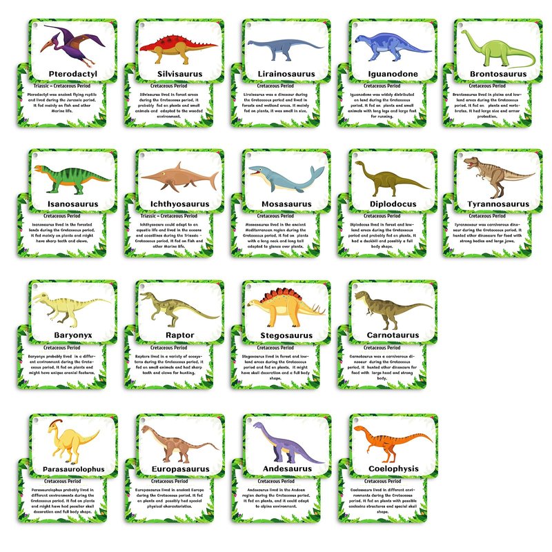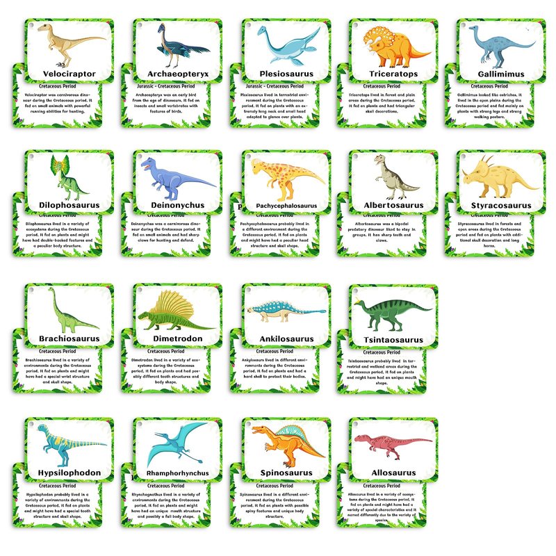 - DEVELOP MEMORY AND LANGUAGE SKILLS: Matching the reusable dinosaur cognition flash cards,children can learn about 36 different species of Jurassic dinosaurs and their habits and characteristics, which aids in vocabulary building and memory as kids learn.