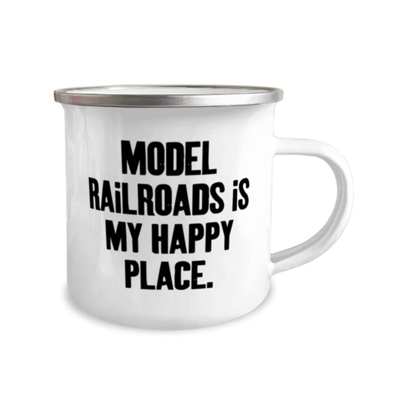 Reusable Model Railroads 12oz Camper Mug, Model Railroads is My Happy Place, Joke Gifts for Friends, Birthday Gifts, Model train set, Toy trains, Train tracks, Railroad toys, Electric trains, Battery
