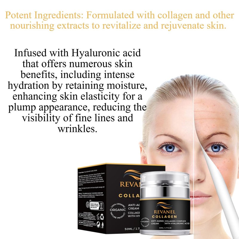 - REVANEL Collagen cream provide several skin benefits, such as improving skin elasticity, hydration, and texture, which lead to a more youthful appearance. It reduce the appearance of fine lines and wrinkles by promoting skin plumpness and firmness.