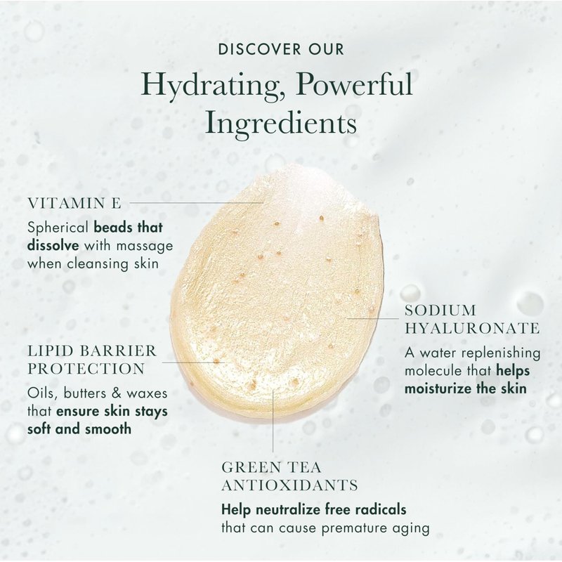 - Key Ingredients - This hydrating facial cleanser is formulated with a unique combination of Vitamin E beads, oils, butters and waxes that work with cleansing agents to effectively remove any impurities and excess sebum while ensuring that skin stays moisturized, soft and smooth.