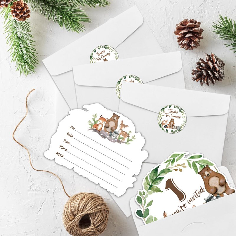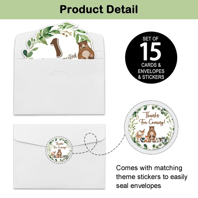 - Birthday Party Invitation Sets: There are 15 woodland animals 1st birthday theme shaped invitation cards, 15 premium white envelopes and 15 matching envelope seal stickers in this package. These beautiful invitations will make your party the talk of town and make the guests excited to come and participate.