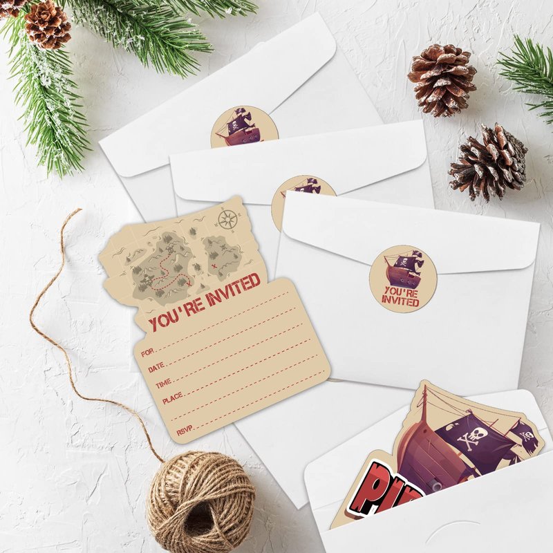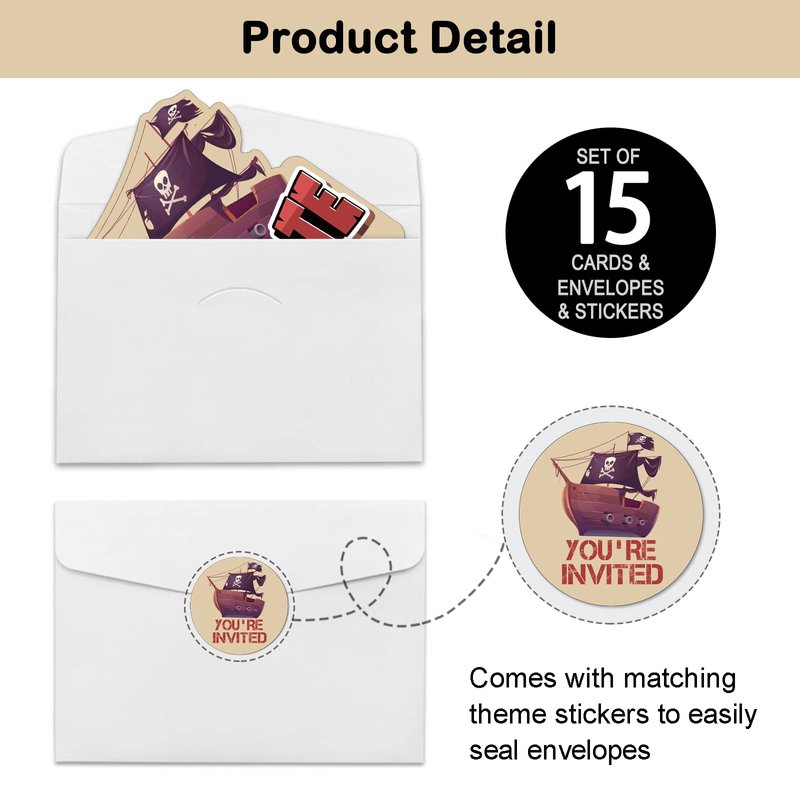 - Pirate Birthday Party Invitation Sets: There are 15 pirate ship shaped invitation cards, 15 premium white envelopes and 15 matching envelope seal stickers in this package. These beautiful invitations will make your party the talk of town and make the guests excited to come and participate.