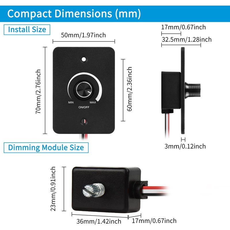 - WIDE APPLICATION: 12V dimmer switch works with 12v dimmable LED light/halogen/incandescent/single color strip light,12v led dimmer switch for camper, RVs, trailers, vans,trucks, motorcycle yacht and so on. Fits in small spaces.