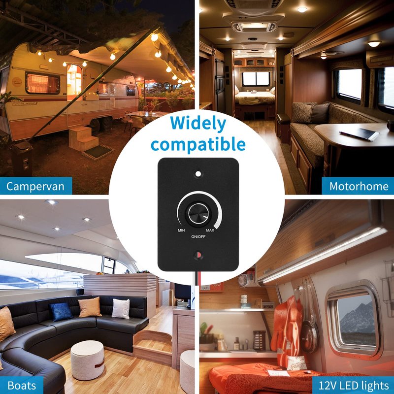 - STEPLESS DIMMING FLICKER FREE: 12V DC dimmer switch can achieve 3-100% stepless dimming, without noise and flashing. You can easily adjust the light according to different environment needs, energy- saving and extend the life of the bulb, creates a best atmosphere in your rv.