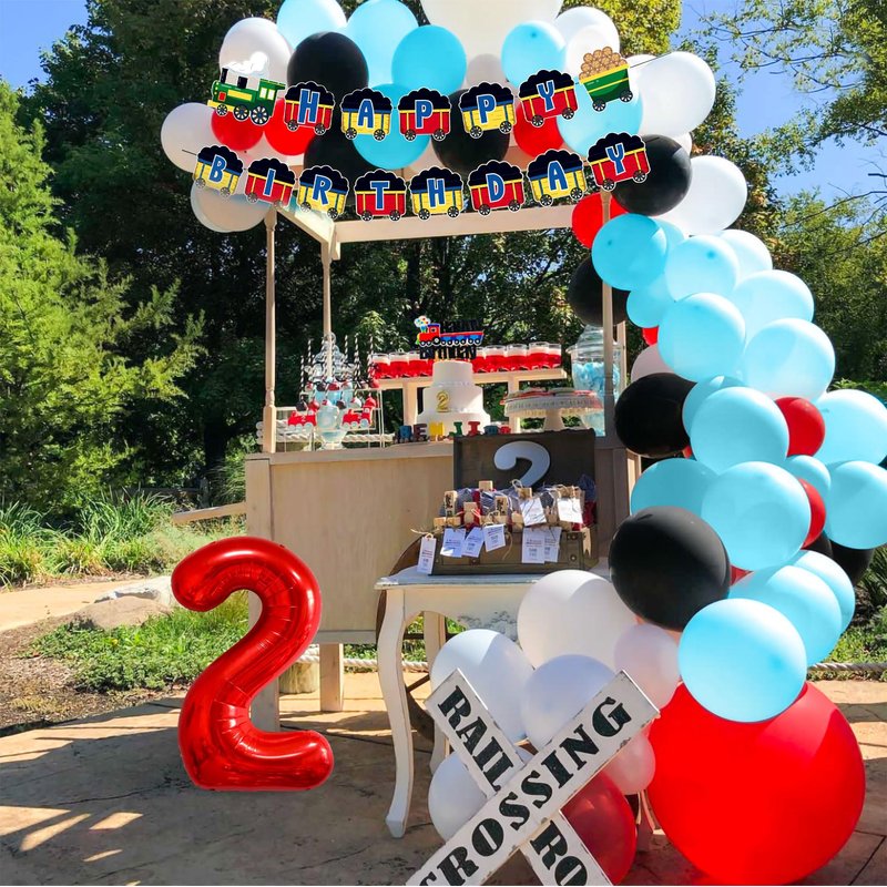- You will get: 2 x train balloons, 1 x train birthday banner, 20 x latex balloons, 1 x train birthday cake topper, 1 x chugga chugga two two balloons, 1 x 30 inch “2” letter balloon ,as shown