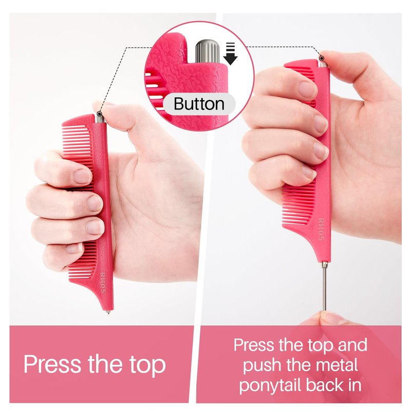 - 【Easy to Use】Press the button on the top of the comb when you need to use to pull out the pin tail.And you can also adjust the length of the tail to suit your needs.When finished,press the top button again to retract the tip,clean and safe.
