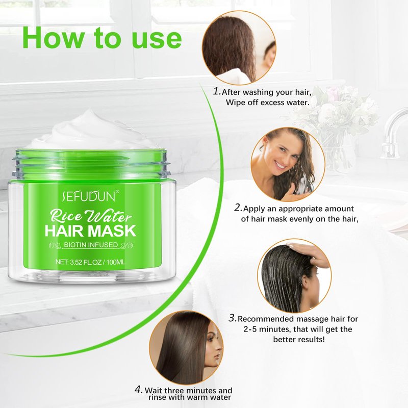 Why do you need this Rice Water Hair Treatment Mask? Hairdressing Secrets of Yao Women Yao women are famous for their long hair, and their secret is fermented rice water. SEFUDUN Fermented Rice Water Hair Mask has a nourishing and moisturizing formula, it is rich in antioxidants and vitamins, it adds shine and beauty to your hair, revitalizes and retains moisture, strengthens each strand and prevents breakage, thereby promoting Hair grows stronger and longer. how to use: Cleanse your hair and scalp with a fermented rice water shampoo. Apply Fermented Rice Water Hair Mask to tresses from hair roots to ends. Leave the mask on for 15-20 minutes, then rinse gently with water.