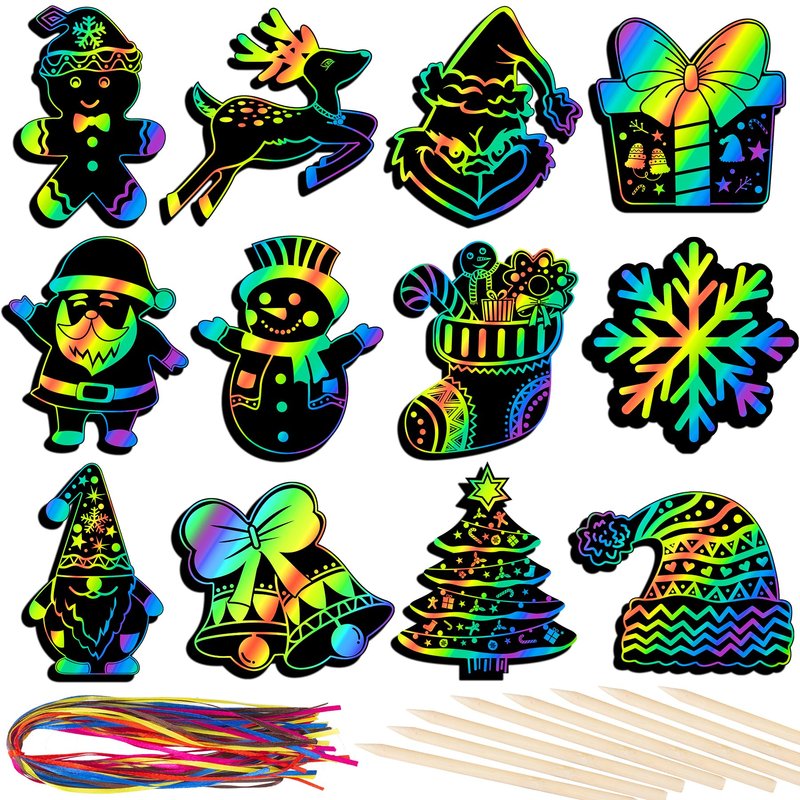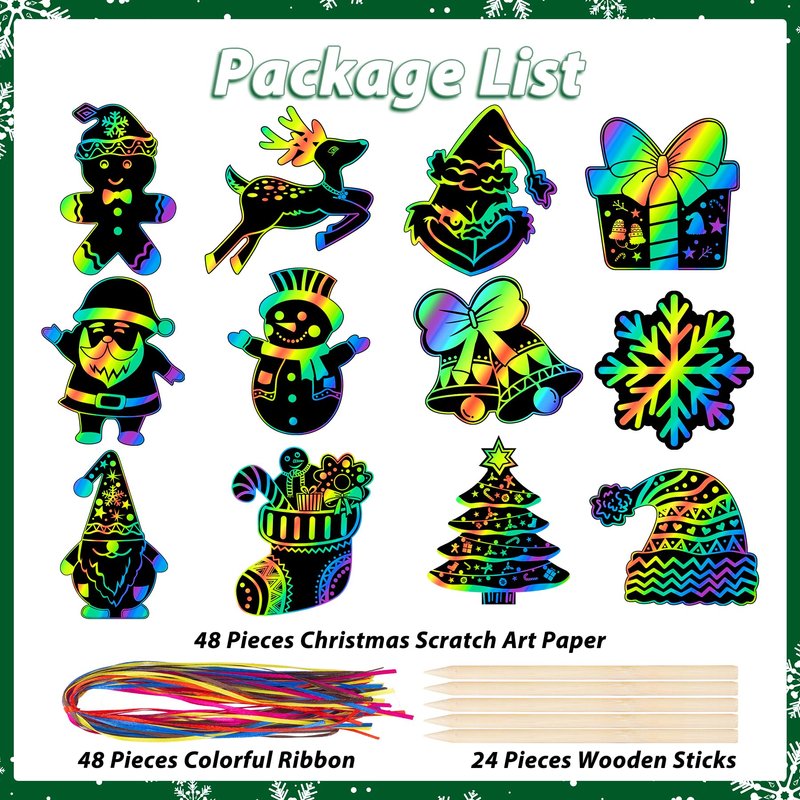 - What You Will Get: Our Christmas scratch art kit has 48 pieces of Christmas craft rainbow scratch paper, a total of 12 patterns, 4 pieces per pattern, 48 ribbons, and 24 wooden sticks. Sufficient quantity and different styles to meet your Christmas gift needs.