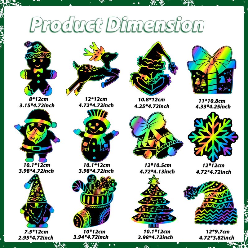 - Unique Christmas Ornaments: Dive into the Holiday Magic with 12 Different Christmas Patterns, including Bells, Santa Claus, Elk, Snowman, Xmas Tree, Grinch, and Gifts. Versatile Scratch Papers Perfect for Scrapbooking, Personalized Gift Tags, and Festive Decorations.