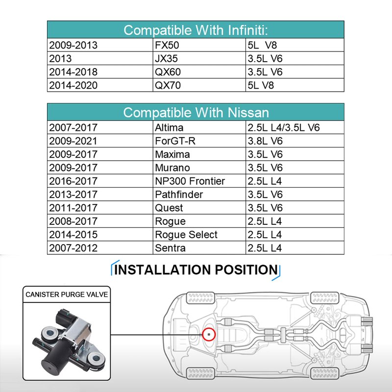 Fitment Information [For INFINITI] For INFINITI FX50 2009-13 5L V8 For INFINITI JX35 2013 3.5L V6 For INFINITI QX60 2014-18 3.5L V6 For INFINITI QX70 2014-20 5L V8 [For Nissan] For Nissan Altima 2007-17 2.5L L4/3.5L V6 For Nissan GT-R 2009-21 3.8L V6 For Nissan Maxima 2009-17 3.5L V6 For Nissan Murano 2009-17 3.5L V6 For Nissan NP300 Frontier 2016-17 2.5L L4 For Nissan Pathfinder 2013-17 3.5L V6 For Nissan Quest 2011-17 3.5L V6 For Nissan Rogue 2008-17 2.5L L4 For Nissan Rogue Select 2014-15 2.5L L4 For Nissan Sentra 2007-12 2.5L L4
