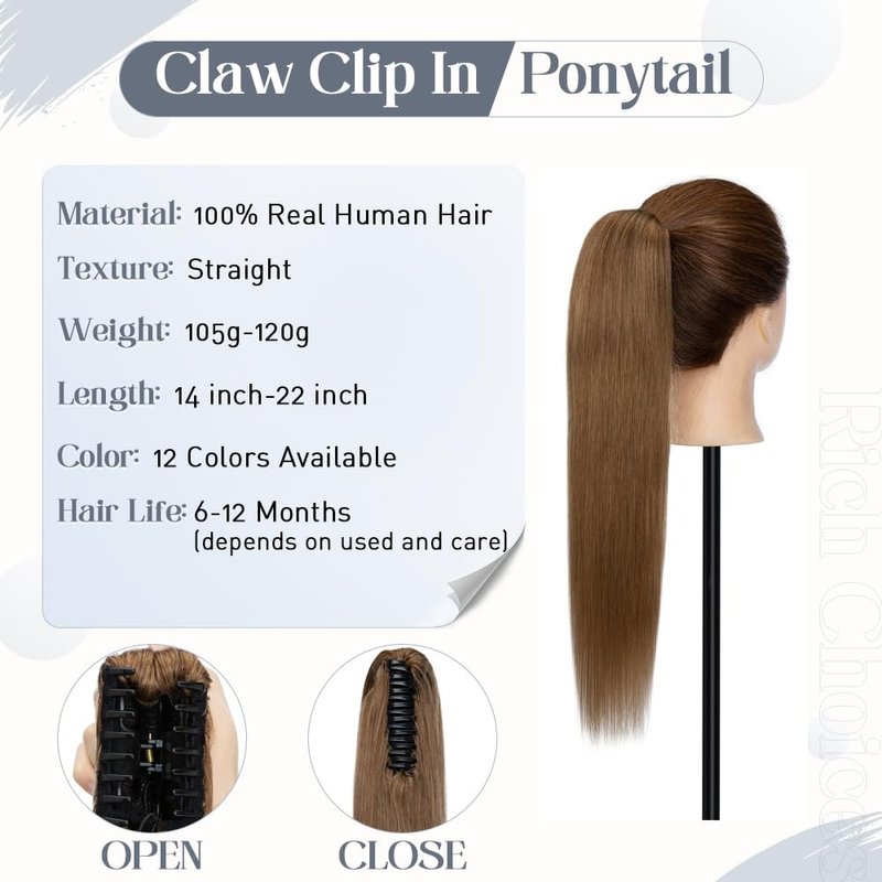 Rich Choices Claw Clip Ponytail Extension Human Hair 22 Inch Real Hair Ponytail Extension Balayage #6 Light Brown 120g One Piece Clip In Long Ponytail Hair Extensions Straight For Women