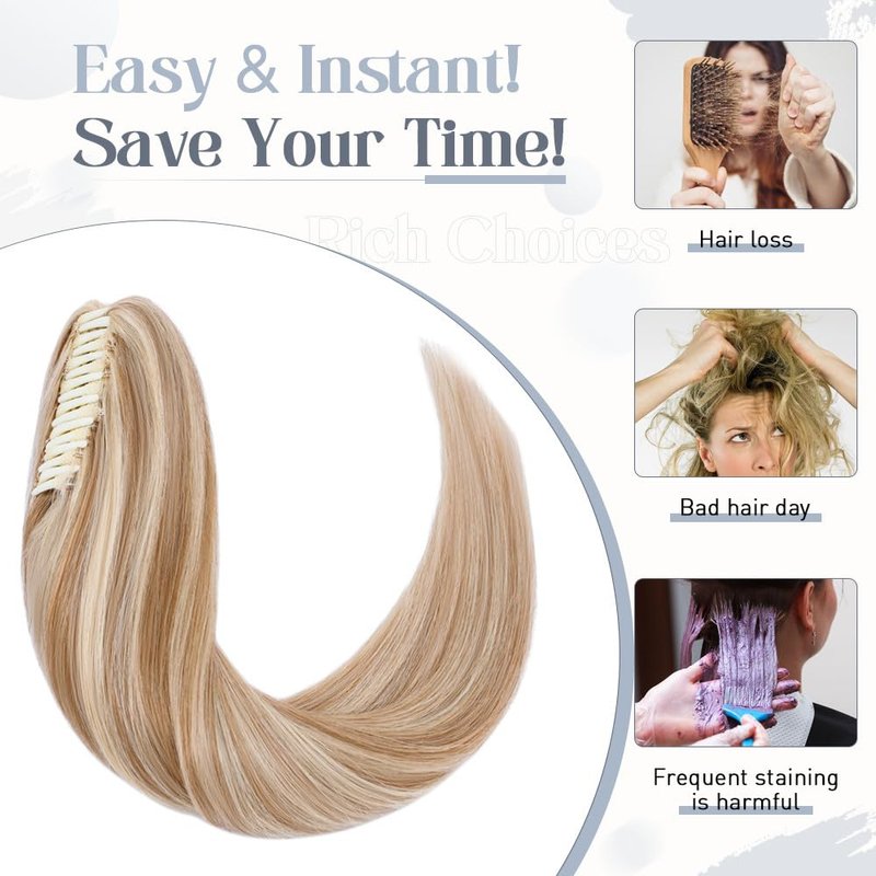 Rich Choices Claw Clip Ponytail Extension Human Hair Real Hair Ponytail Balayage Golden Brown Highlighted Bleach Blonde 18 Inch 115g One Piece Clip In Long Ponytail Hair Extension For Women #12P613