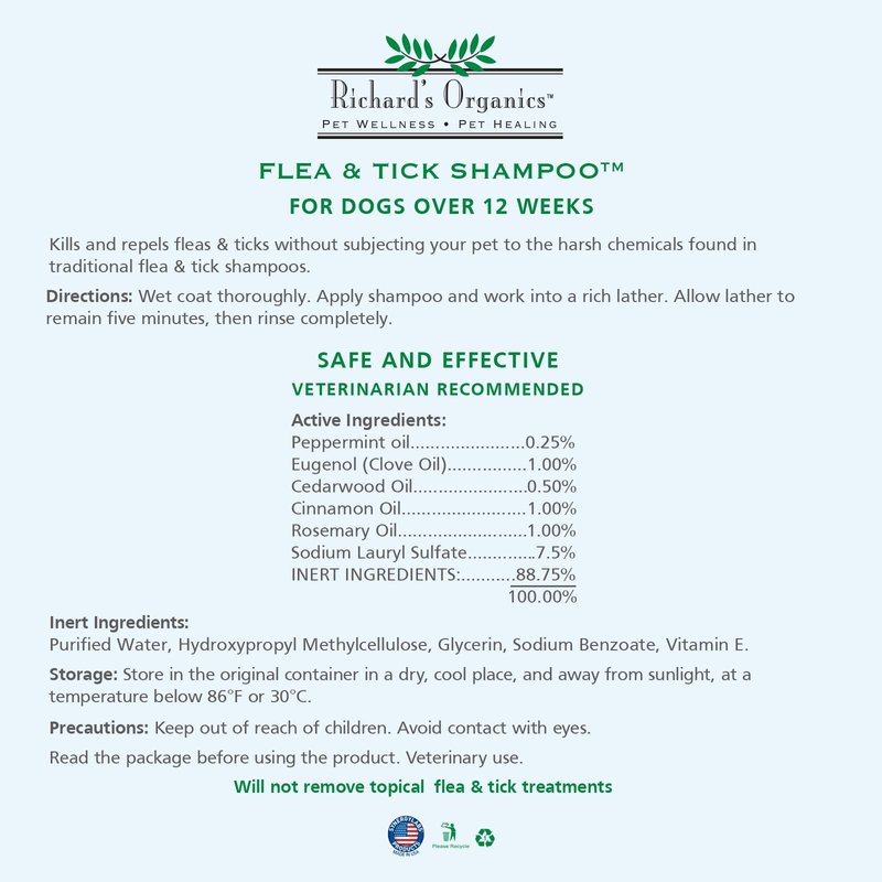 - FAST ACTING – You will see fleas coming off your dog as you bathe with Richard’s Organics Flea and Tick Shampoo. Ticks let go and are more easily removed from the skin. For best results, work the lather thoroughly into the dog’s coat and down into the skin, moving back from the head. Allow lather to remain on the dog for a few minutes and then rinse. The essential oils are calming, and your dog will smell great.