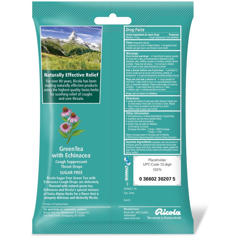 Ricola Sugar Free Green Tea with Echinacea Cough Suppressant Throat Drops, 19ct Bag