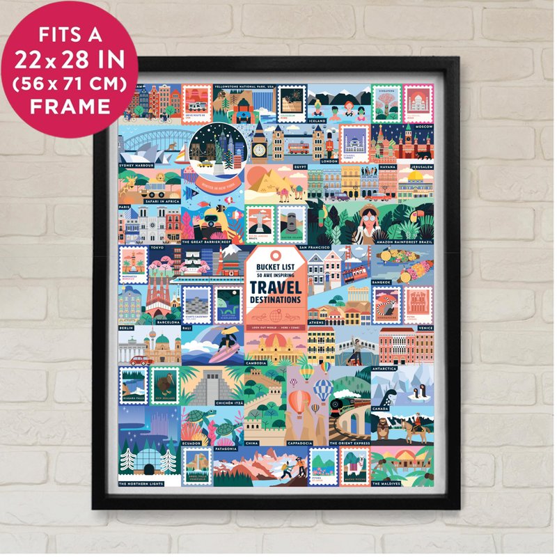 - 🗺️TRAVEL INSPIRATION – Featuring 50 awe-inspiring, beautifully illustrated locales to inspire your next big adventure, once you complete the puzzle, decide where you'll jet off to next.