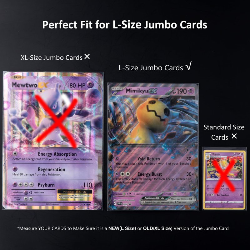 - Package Includes - 100 pack exact sleeves for jumbo card size L. Please measure your jumbo card size before purchase - L size: 5.4"x7.4" , XL Size: 5.7" x7.9".