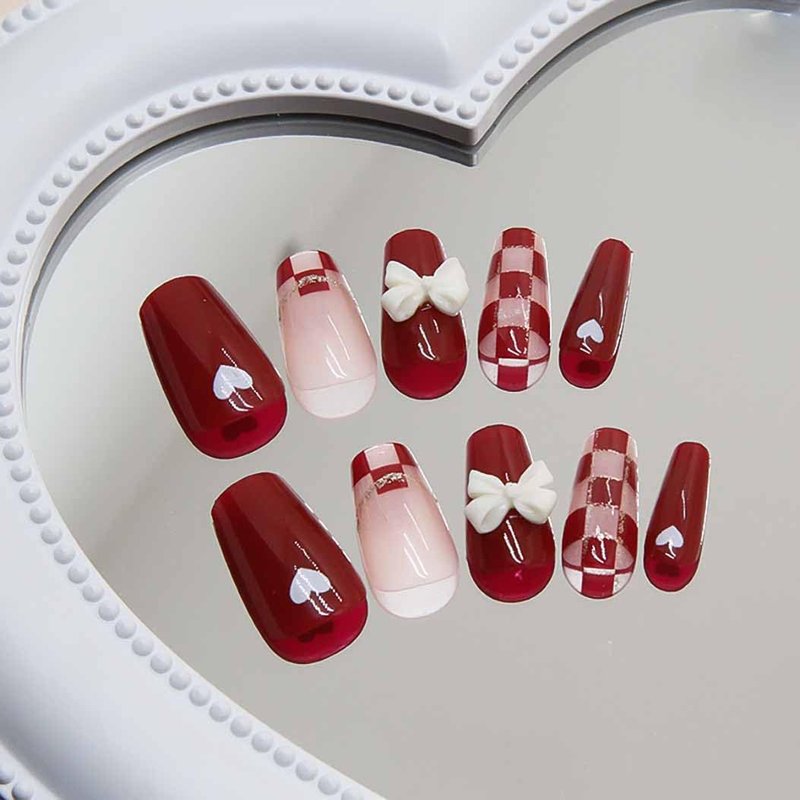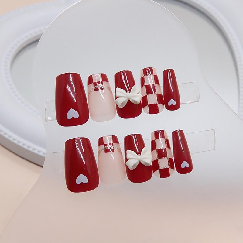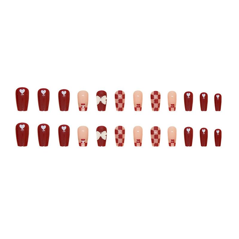 RikView Red Press on Nails Medium Fake Nails Coffin Nails with Hearts Design Glossy Full Cover Nails for Women 24 PCS