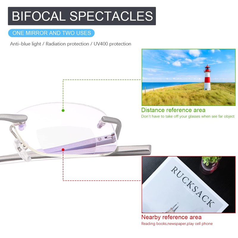 - ✿Rimless Bifocal Reading Glasses - The top part of the lens is clear, while the bottom section is available in your choice of magnification for reading your favorite book, newspaper, or magazine,jobs. (available magnification strength: 1.00, 1.25, 1.50, 1.75, 2.00,2.25, 2.50, 3.00, 3.50) lightweight, durable and stylish rimless bifocal clear reading glasses,perfect for reading near and far or working on your computer.