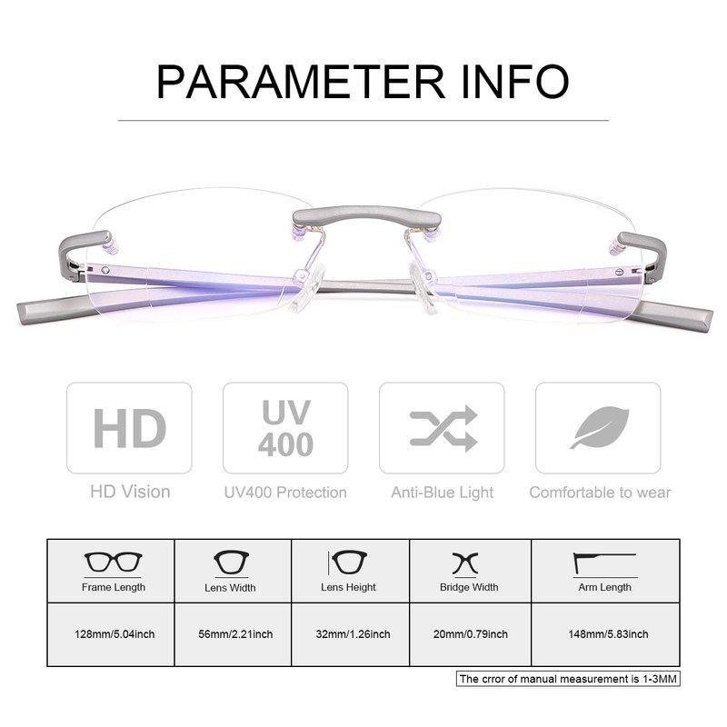 Titanium super lightweight frame provides all day comfort,Unisex, Frameless trimming, the surface is clean and tidy, making the wearing more fashionable and simple.