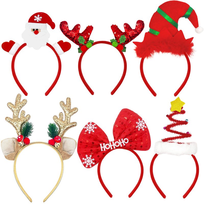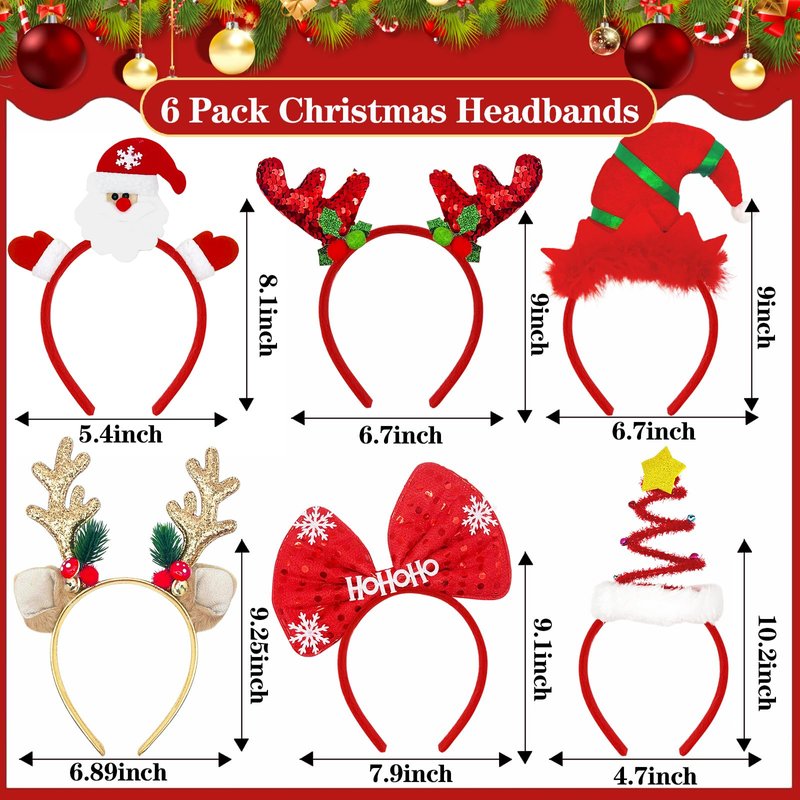 - Christmas headband party set includes 6 different Christmas decorative headbands, these Christmas headbands are very beautiful with Santa Claus, red elk antlers, Santa hat, gold elk antlers, bow and Christmas tree. Perfect for Christmas and family gatherings!