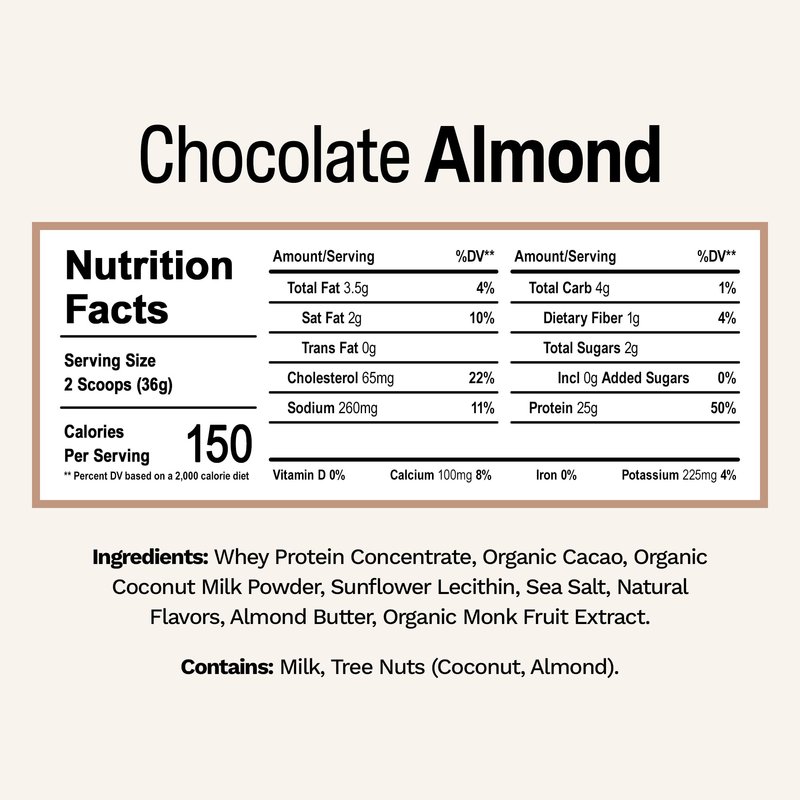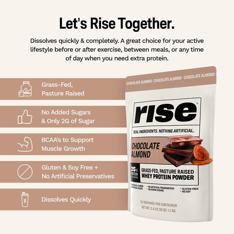 Rise Grass-Fed Whey Protein Powder - Chocolate Almond | 25g Protein No Artificial Flavors, Colors, or Preservatives - Sugar Free, Gluten-Free, Soy Free (2.4 lbs)