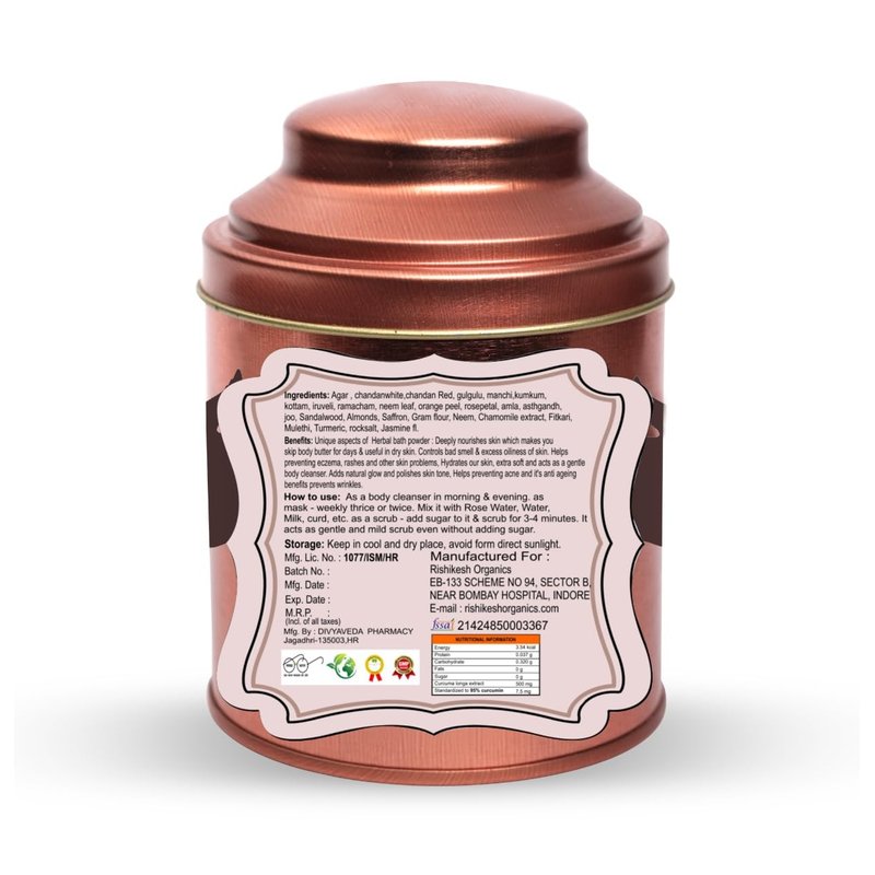 Rishikesh Organics, a trusted name in natural health and beauty products, presents its Organic Body Wash Powder, a luxurious blend of the finest Ayurvedic herbs. This body wash powder is meticulously crafted from a variety of natural ingredients including Chandan Red, Gulgulu, Kumkum, Kottam, Iruveli, Neem Leaf, Orange Peel, Rose Petal, Amla, Sandalwood, Almonds, Saffron, Gram Flour, Neem, Chamomile Extract, Fitkari, Mulethi, Turmeric, Rock Salt, and Jasmine. Each ingredient has been chosen for its unique properties to ensure a holistic and rejuvenating bathing experience.