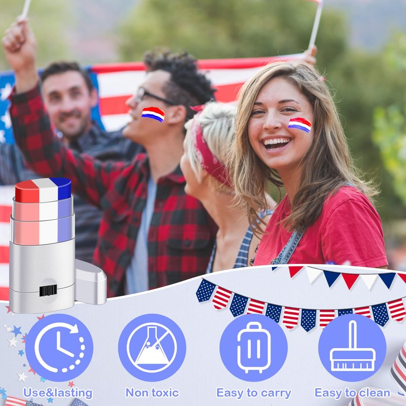 - 【4th of July Face Paint】This red white blue USA flag face body paint stick is designed to be conveniently small,only has about the size of a lipstick,easy to carry.The Independence Day face painting kit is designed with a cover to fit in your pocket or bag without getting dirty.they are light and manageable,which reduces discomfort or heaviness when applied,allowing you to enjoy festivities,physical activities or even a simple day out.
