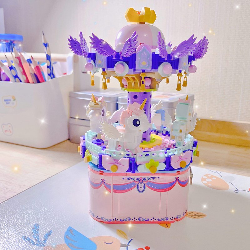 - [What Do You Get]- The Street View Carousel Music Box Bricks Model Set is an amazing DIY building block set that comes with 874 pieces, Its size is 7.28x4.53x4.53in.