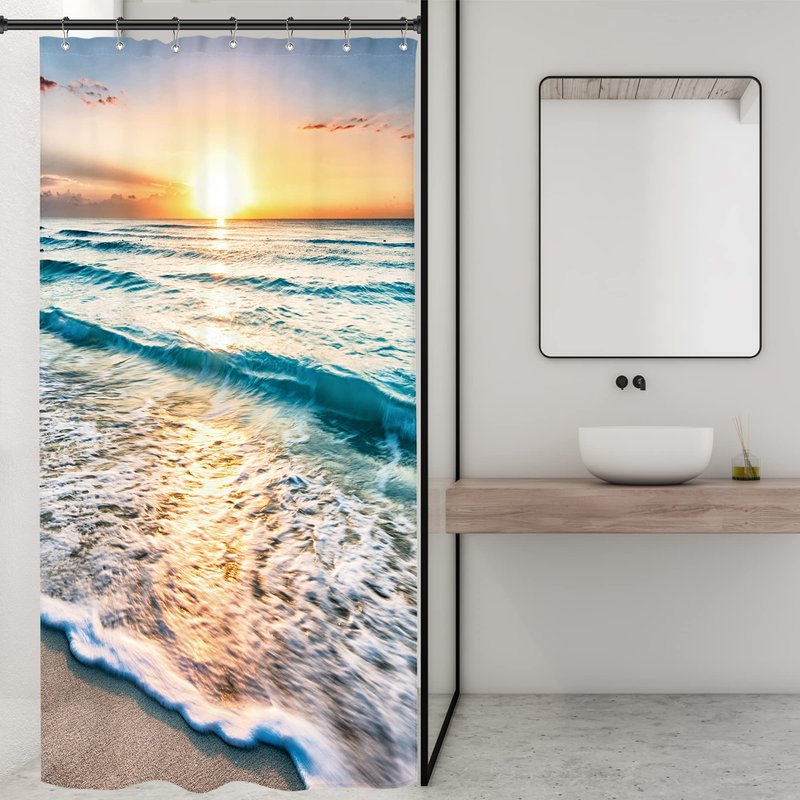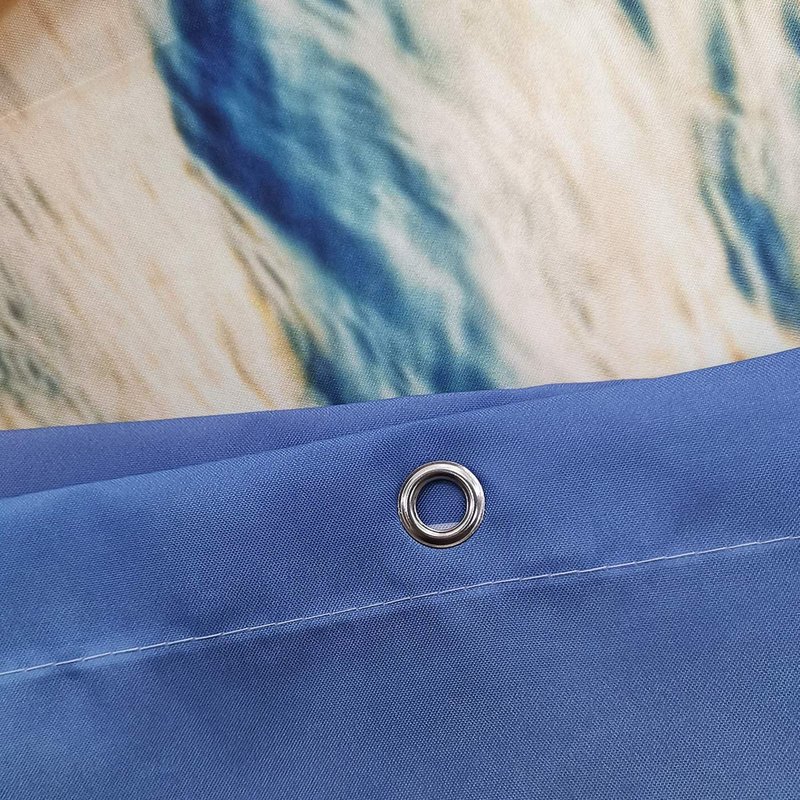This modern shower curtain set is so cool that seaside scene pattern, blue and yellow color. This beautiful shower curtain panel is made of polyester waterproof fabric, Eco-friendly.