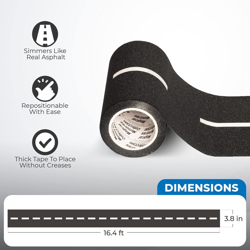 - LOOK JUST LIKE REAL ASPHALT: Unlike all other road tape toys you can find, Magical Memories Collection road tape is realistic looking! It shimmers to look just like real asphalt to bring the make-believe activities to the next level. Your kids will be amazed by how amazing it feels just like riding on real roads. Our road mats are made of heavy duty yet lightweight paper to ensure authentic and lifelike looks, strong and durable quality. Road tape dimensions: 3.8in x 16.4ft.