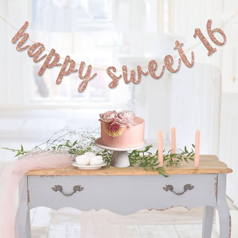 RoadSea Happy Sweet 16 Banner - Girl 16th Birthday Party Garland Supplies- Happy 16th Birthday Party Decorations - Rose Gold Glitter