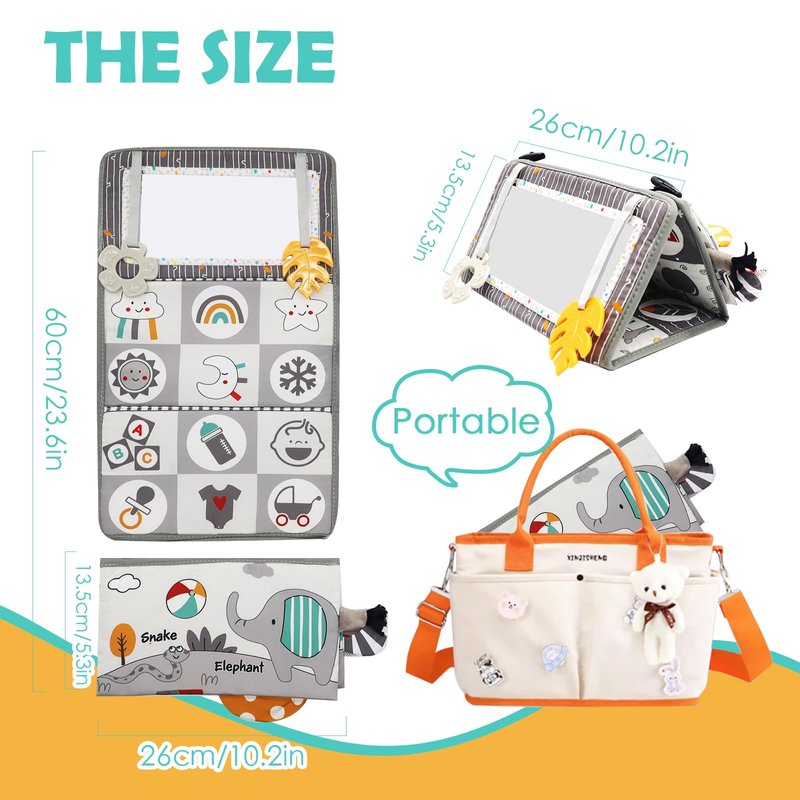 - Foldable & Hangable - The newborn baby mirror tummy time toy calendar is lightweight and folds away. You can tie it to the car headrest with a rear-facing car seat or for crib, stroller, high chair use. It is easy to fold up and put in a bag for going out.【NOTE: There is a protective film on the mirror, please remove it before using it to make the reflection clearer
