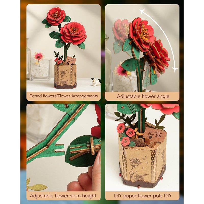 - 【ROBOTIME Model Flower Kit】Our Timeless Wooden Red Camellia, with its exquisite details and pre-colored petals, radiates vibrant, lasting beauty in any room. Symbolizing enduring love and joy, these flowers never wilt, making them a perfect keepsake.